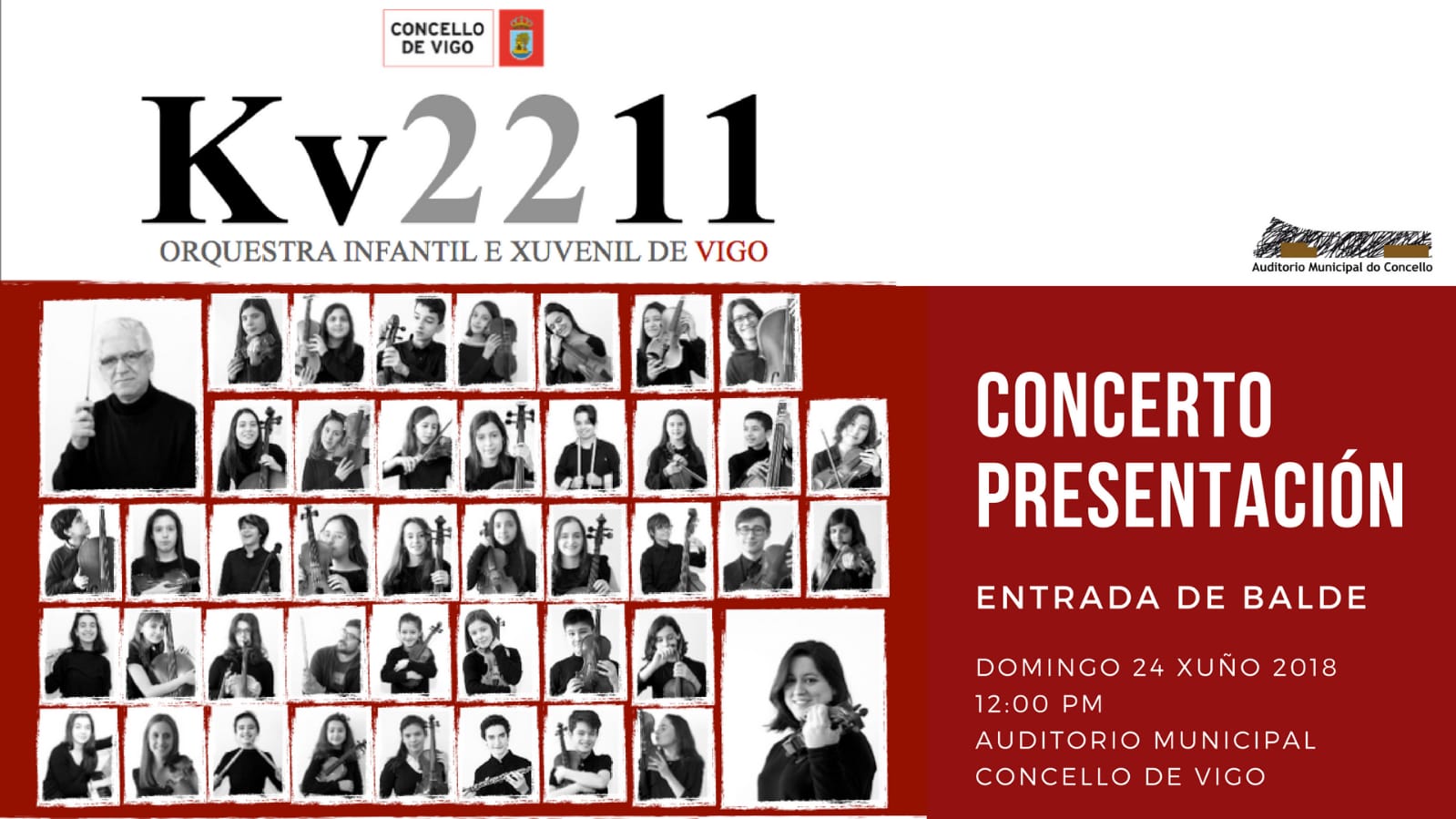 El Auditorio Municipal del Concello de Vigo acogerá el domingo 24 de junio, a las 12:00 h, el concierto-presentación de una nueva orquesta, Kv221 Orquesta infantil y juvenil de Vigo.