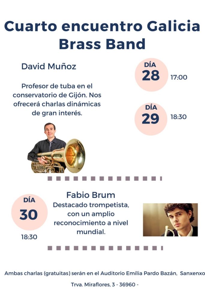 Del 26 al 31 de agosto tendrá lugar en Sanxenxo el IV Encontro Galicia Brass Band. En el mismo se llevarán a cabo una serie de charlas gratuitas en el auditorio de dicha localidad, a cargo de David Muñoz y Fabio Brum.