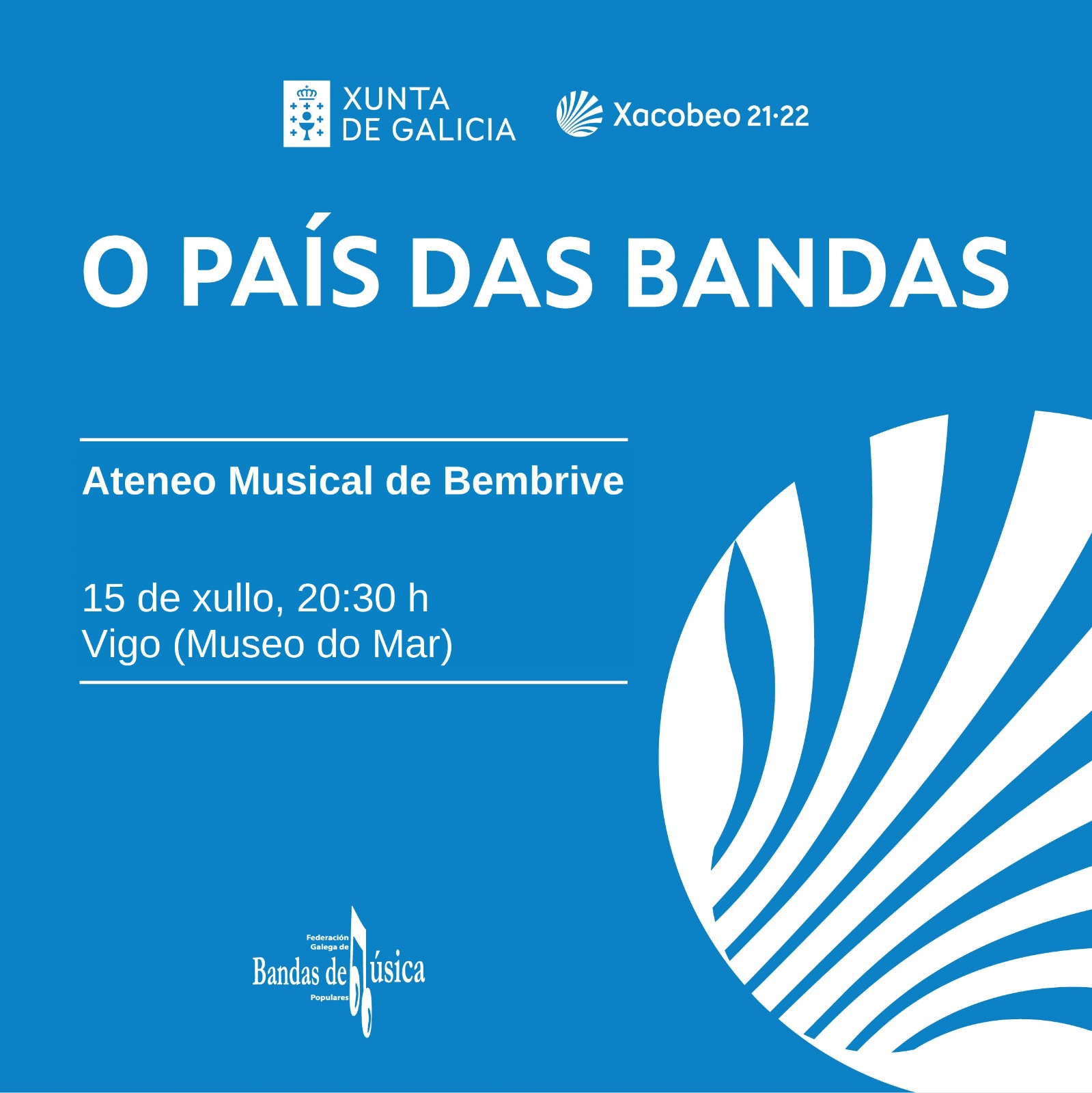 Dentro del ciclo de conciertos «O país das bandas» del Xacobeo para este 2021, el Ateneo Musical de Bembrive actuará el jueves 15 de julio a las 20:30h en los exteriroes del Museo del Mar de Vigo. El aforo será limitado.