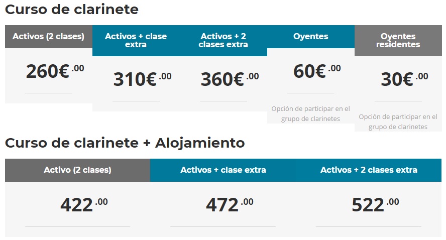 - Clarinete: del 16 al 22 de agosto 2018. Siendo los profesores Vicente Alberola, Javier Martínez García y Nikita Vaganov.